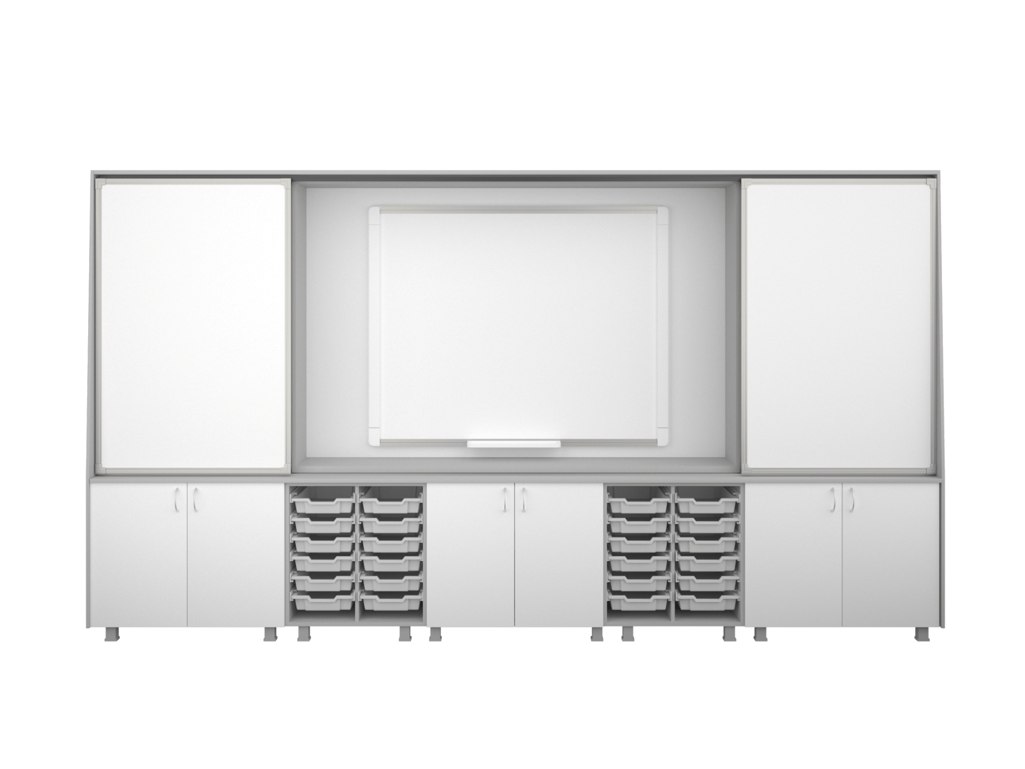 Система хранения с многофункциональными раздвижными досками представляет собой универсальную систему хранения с интегрированной в нее системой раздвижных магнитно-маркерных досок и секции под интерактивную доску. Универсальная система состоит из верхней и нижней частей. В нее входят: секция под интерактивную систему, шкафные системы хранения, 4 раздвижные доски, 12 боксов для хранения.